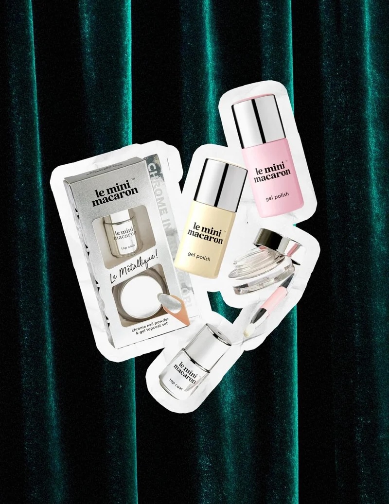 Le Métallique: Strieborný chrómový prášok so štetcom a mini Top Coatom — zrkadlový kovový lesk.