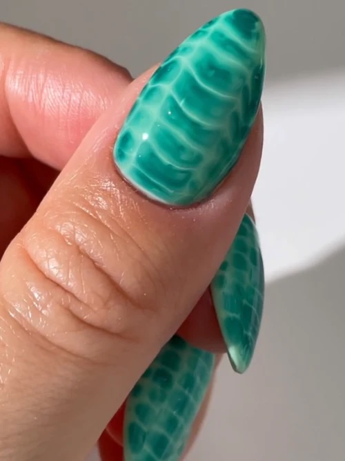 Výsledok: Plynulé ombre prechody — každý necht je iný, pripomína vodnú hladinu alebo rastlinu.