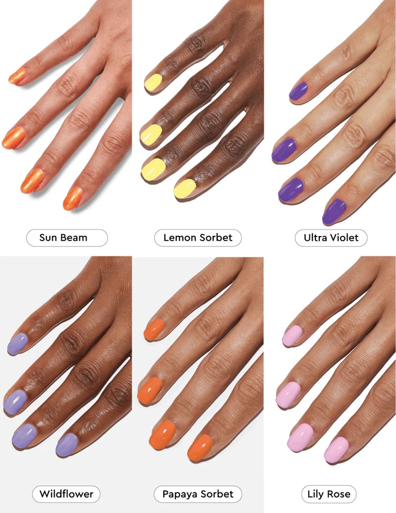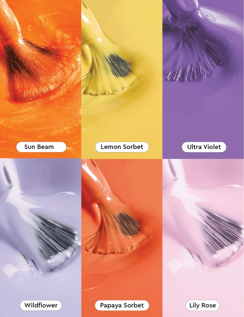 Teplé tóny: Lemon Sorbet (svieža žltá) a Sun Beam (slnečná oranžová) — hrejivé odtiene zlatej hodiny.